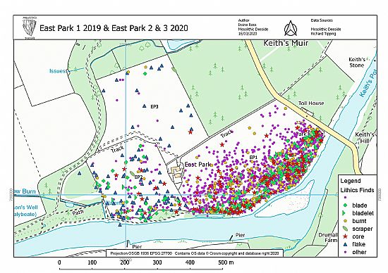 The final map collates information from Fieldwalking by the Over Fifties Archaeological Research Society (OFARS), Sheila Duthie, Dr Jane Kenney, Dr J C Grieve and Mesolithic Deeside.